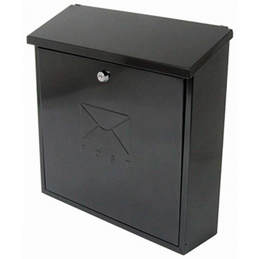 Contemporary post box in black, boxed, H368mm x W368mm x D116mm. Top opening flap, narrow style slot & secure lock to protect mail. Reverse fixing option so can be mounted on the rear of a gate or door & used in conjunction with a letter box. • Ideal for fixing against a wall, gate or fence, with the fixings included in the box • Drop front opening to access mail and top opening letter flap for improved weather protection • Additional rear slot ideal for reverse mounting behind a letter plate • Accepts envelopes up to a size of C4 (275mm W x 35 mm H) • Material: Steel Post Slot Size: 34mm H x 360mm W Rear Slot Size: 29mm H x 279mm W