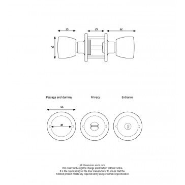 | Size/Dimensions | Adjustable to 60 or 70mm back set / 50mm dia knob / 67mm dia rose |