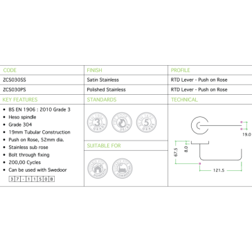 | Size/Dimensions | Rose – 52mm dia / Lever – 121.5mm x 19mm dia / Projection (to outside of handle) – 67.5mm |